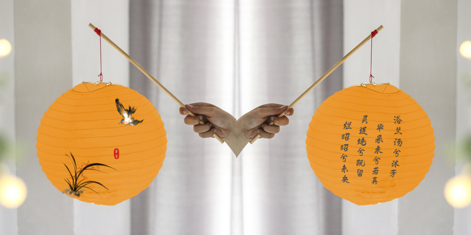 灯笼为橘色底色,结合《九歌·云中君》中诗词元素、屈原辞作中出现次数较多的兰草元素、演艺秀中云中君所代表的云中雀的国风形象元素,设计声控手提灯笼产品,产品与演艺秀氛围相呼应,提升游客体验。